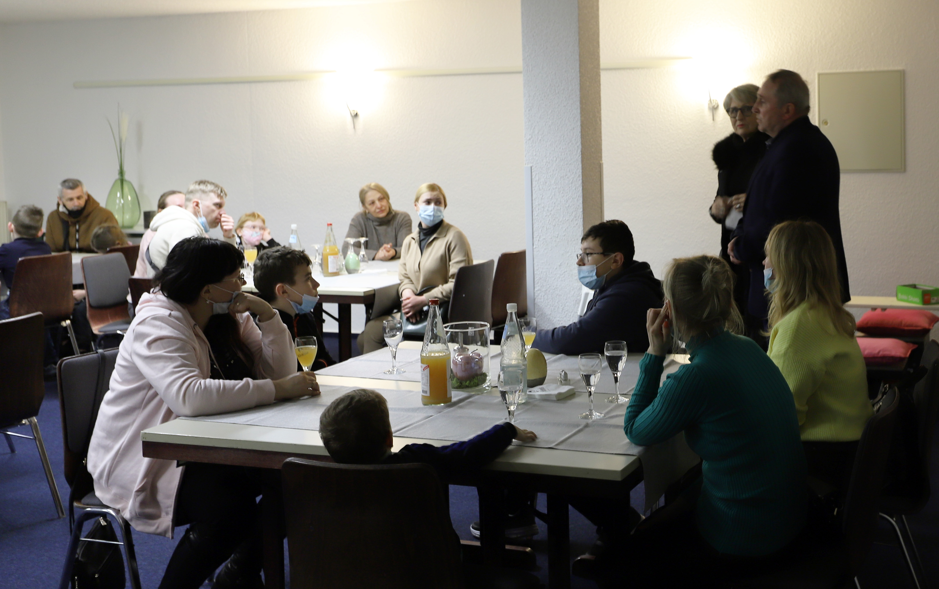 Eine wichtige Aussicht. Denn die Neuankömmlinge werden sich hier erst einmal orientieren müssen. Die tastenden Blicke derer, die ihre ersten wackeligen Schritte aus dem hohen Bus in Richtung Sicherheit tun und später langsam das Hotel erforschen, erzählen davon. Von Verunsicherung, Erschöpfung, Angst. Schatten des Schreckens, die der Krieg in ihren Augen zurückgelassen hat. Aber da ist noch etwas Anderes. Das Begreifen, dass sie hier und heute, an diesem kühlen Freitagabend, in einem Haigerer Hotel, in Sicherheit sind. 1547,90 km Luftlinie vom Krieg entfernt. „Wir können Herrn Loh hierfür nur danken“, sagt Sergey Lakhno, in die Stille des umfunktionierten Konferenzraumes hinein. Alle klatschen. Und einige lächeln erschöpft. Vielleicht an diesem Tag das erste Mal.