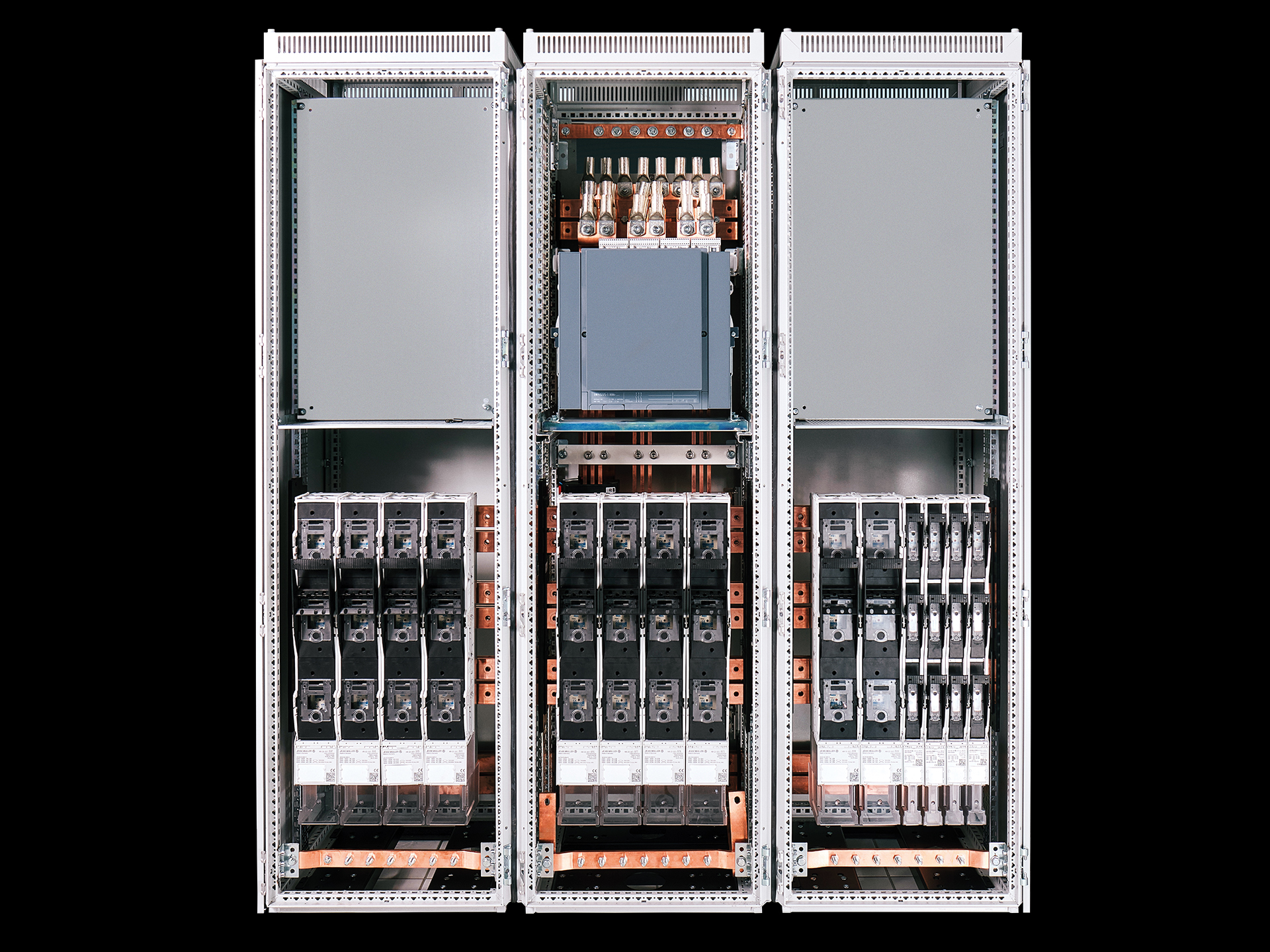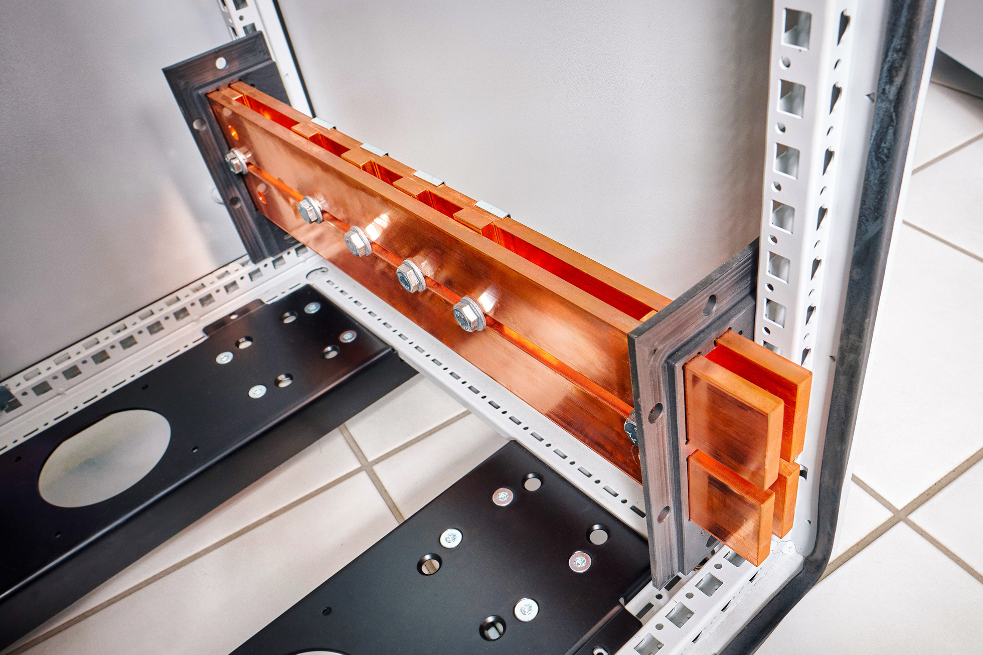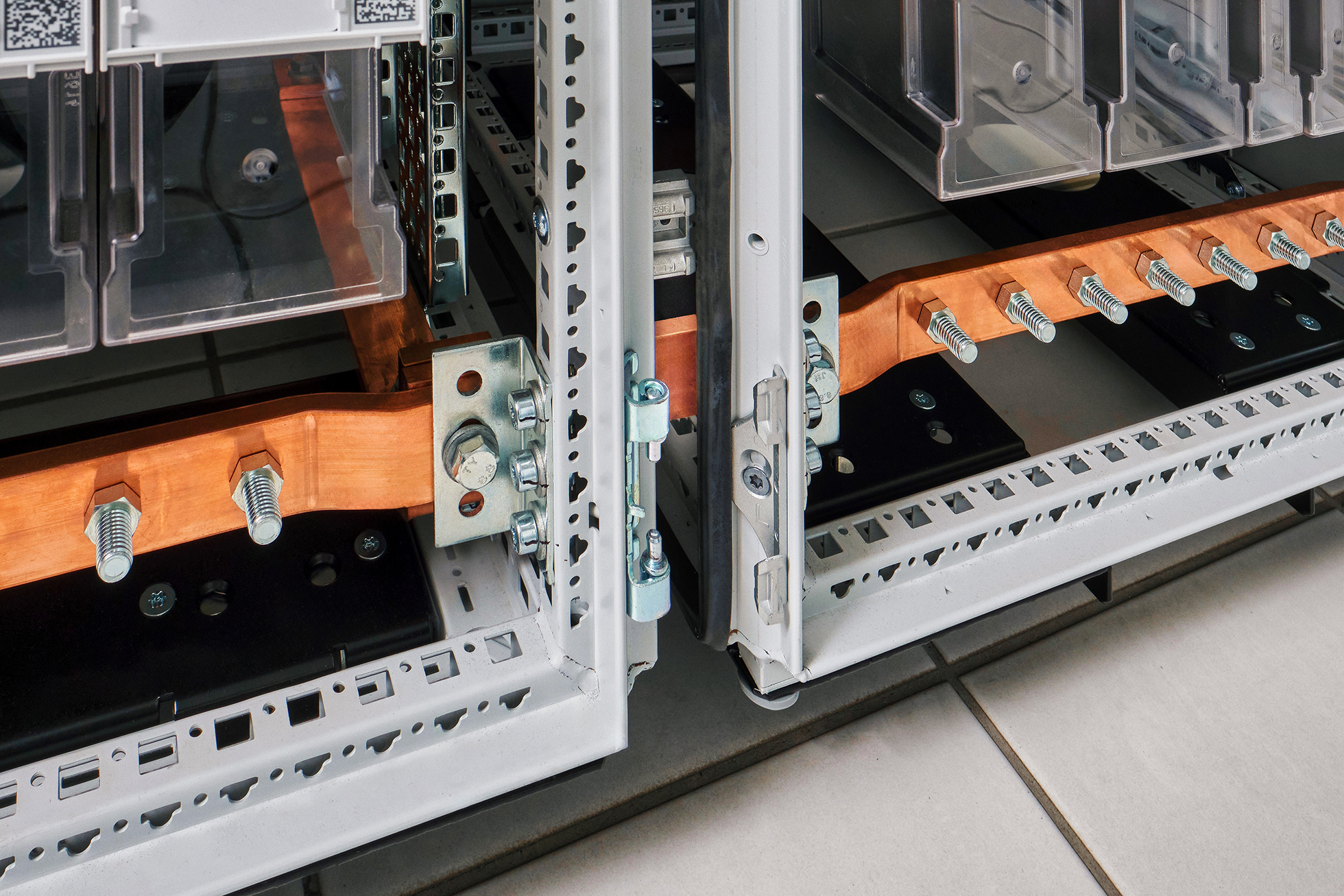 Die Hauptsammelschiene ist so angeordnet, dass sie eine effiziente Verteilung der Verlustwärme des Leistungsschalters und der Lastschalt-Trennleisten ermöglicht. Die N-Leiter-Sammelschiene ist im unteren Rückbereich des Feldes positioniert und wird durch direkte Verschraubung mit dem Rahmenprofil befestigt. Diese Anordnung gewährleistet eine einheitliche Struktur der Schienen in den angrenzenden Abgangsfeldern. Das Kombifeld ist für einen Bemessungsstrom von 2370 A geprüft und verfügt über eine passive Lüftung. Die Kurzschlussfestigkeit liegt bei 50 kA/1s bzw. 110 kA.
