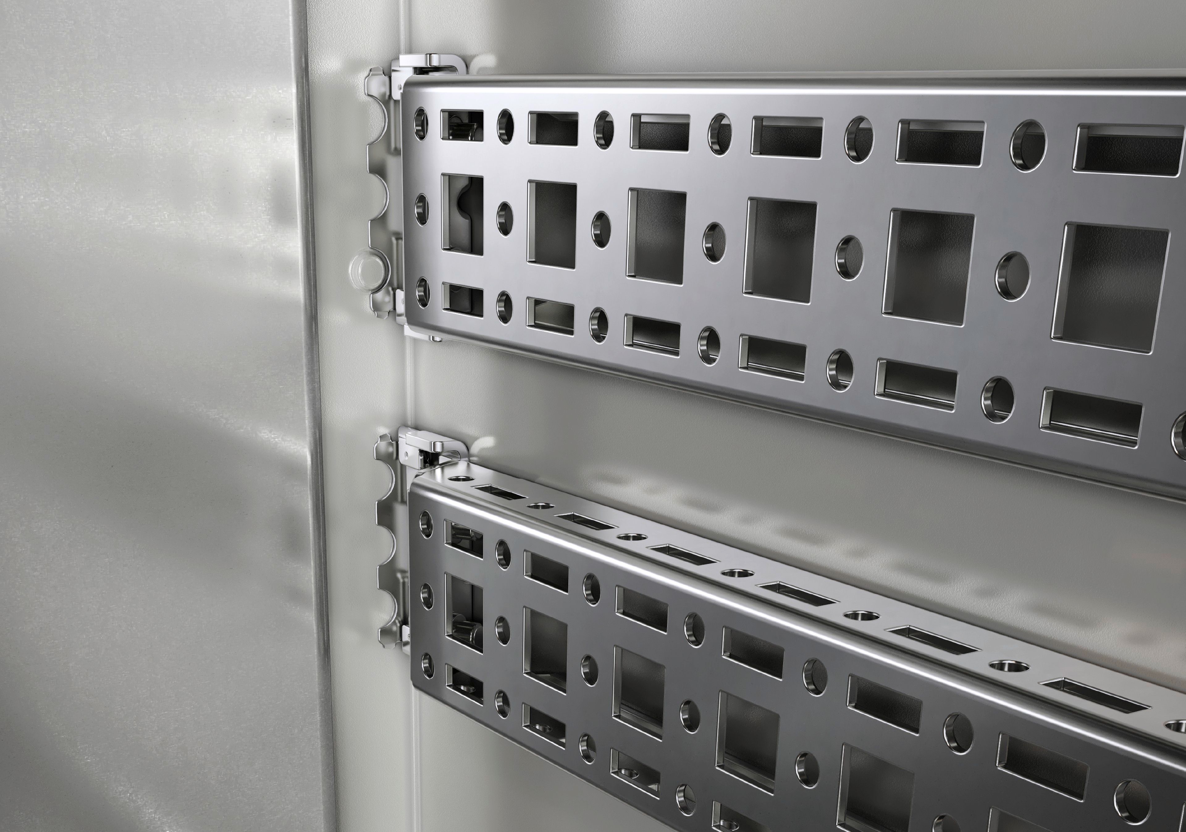 - Pour le montage dans le coffret, sans perçage. Le montage s'effectue sur les bossages présents dans les coffrets au niveau de ses parois latérales, de sa base et de son toit. Dotés de deux rangées de perforations, ces rails fournissent une surface de montage supplémentaire pour p. ex. : rails de montage 14 x 39 mm, lampes pour armoires électriques, contact de porte, blocages de porte, supports de goulotte souple.