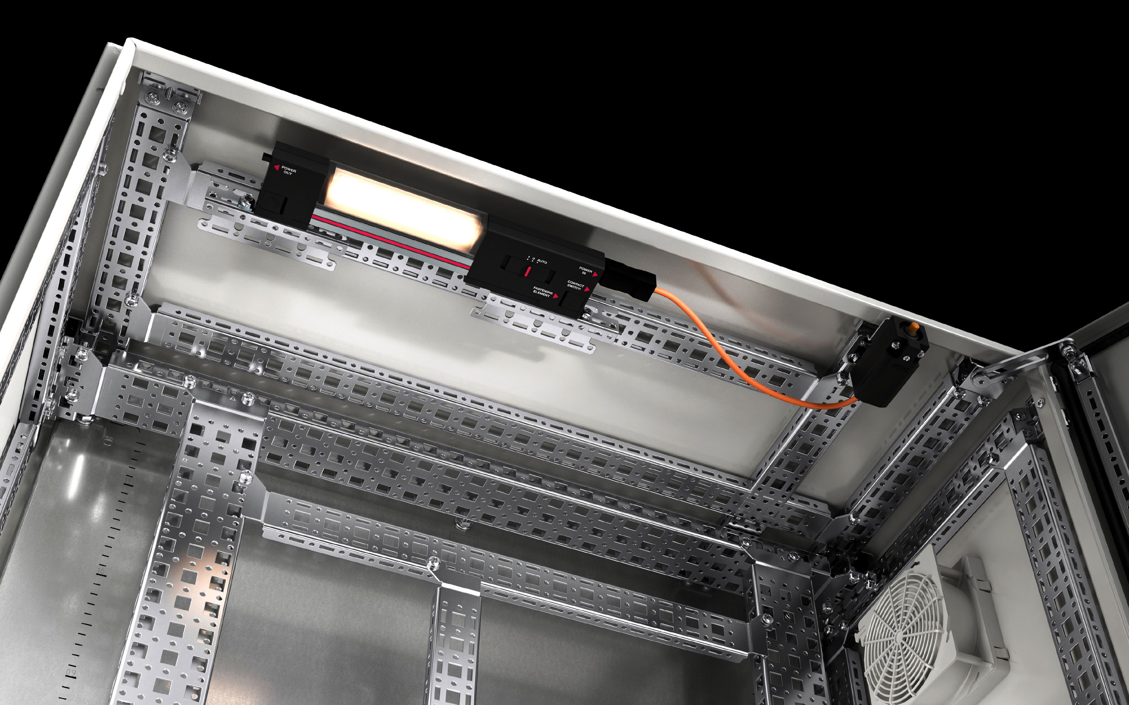 - Pour le montage dans le coffret, sans perçage. Le montage s'effectue sur les bossages présents dans les coffrets au niveau de ses parois latérales, de sa base et de son toit. Dotés de deux rangées de perforations, ces rails fournissent une surface de montage supplémentaire pour p. ex. : rails de montage 14 x 39 mm, lampes pour armoires électriques, contact de porte, blocages de porte, supports de goulotte souple.