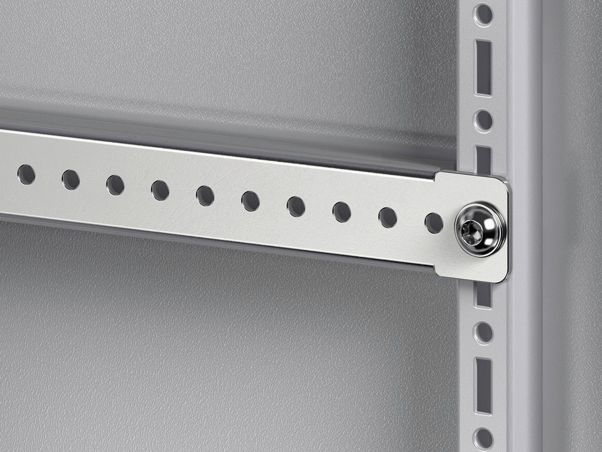 Traverse de montage pour armoires VX, TS, VX SE, pupitres TP et coffrets AX Pour la fixation aisée de goulottes de câbles, de supports de goulotte, de plastrons de protection, d'équipements de porte, de retenues et de fixations des câbles.