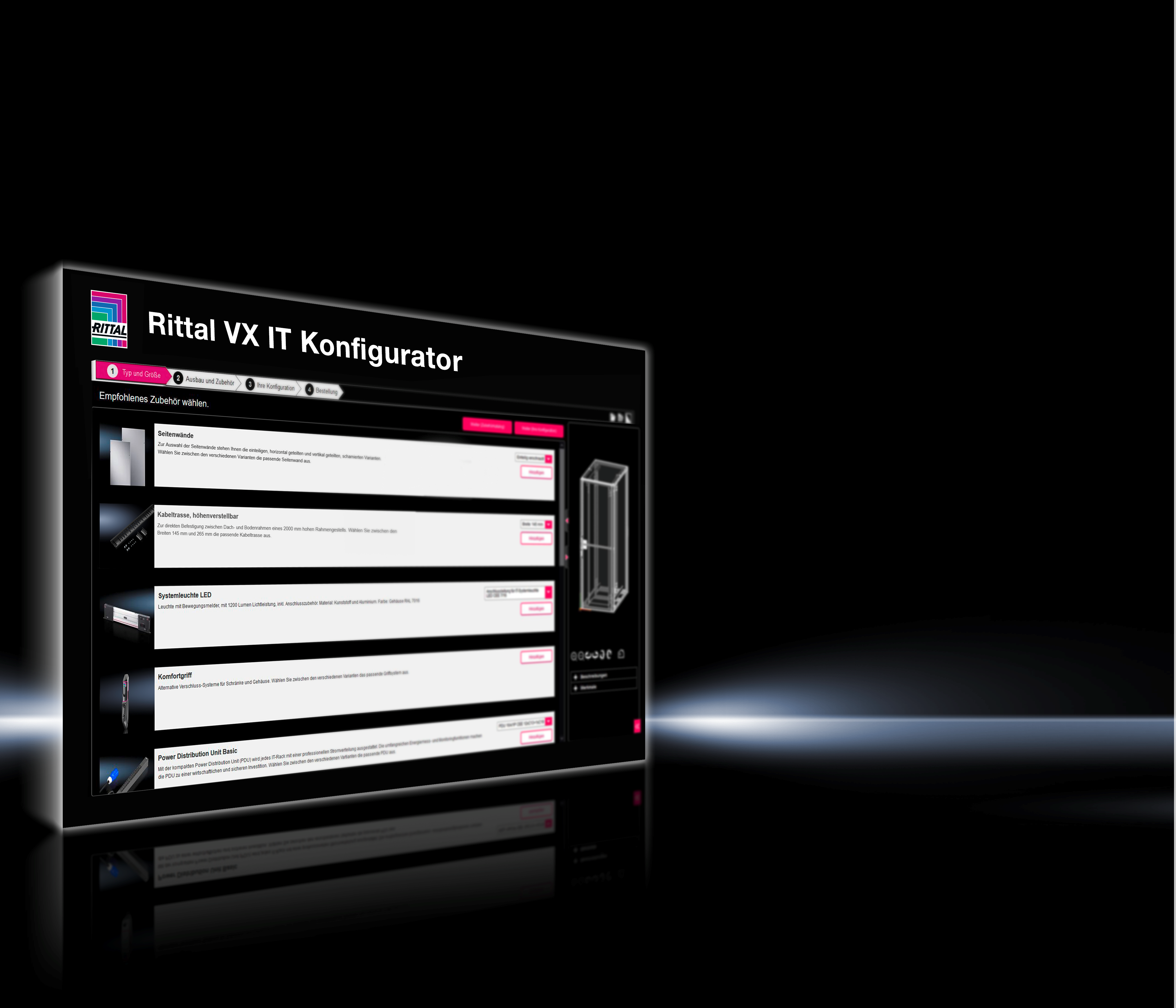 Een online configurator begeleidt de gebruiker stap voor stap bij het opbouwen van een 3D-model. De klant heeft bovendien keuze uit een breed scala aan componenten en accessoires die individueel kunnen worden geconfigureerd. Alle VX IT varianten en de componenten die met de configurator zijn ontworpen, zijn reeds getest en gecertificeerd in overeenstemming met internationale normen zoals UL 2416, IEC 60950 en IEC 62368. De klant is bovendien zeker dat alle componenten in perfecte harmonie werken. Met deze oplossing kunnen IT-managers kostbare tijd besparen bij de planning en de inkoop. Het IT-rack wordt in een zeer hoge kwaliteit geproduceerd in een ultramoderne productiefaciliteit en door de geoptimaliseerde logistiek wordt het snel en op tijd geleverd.