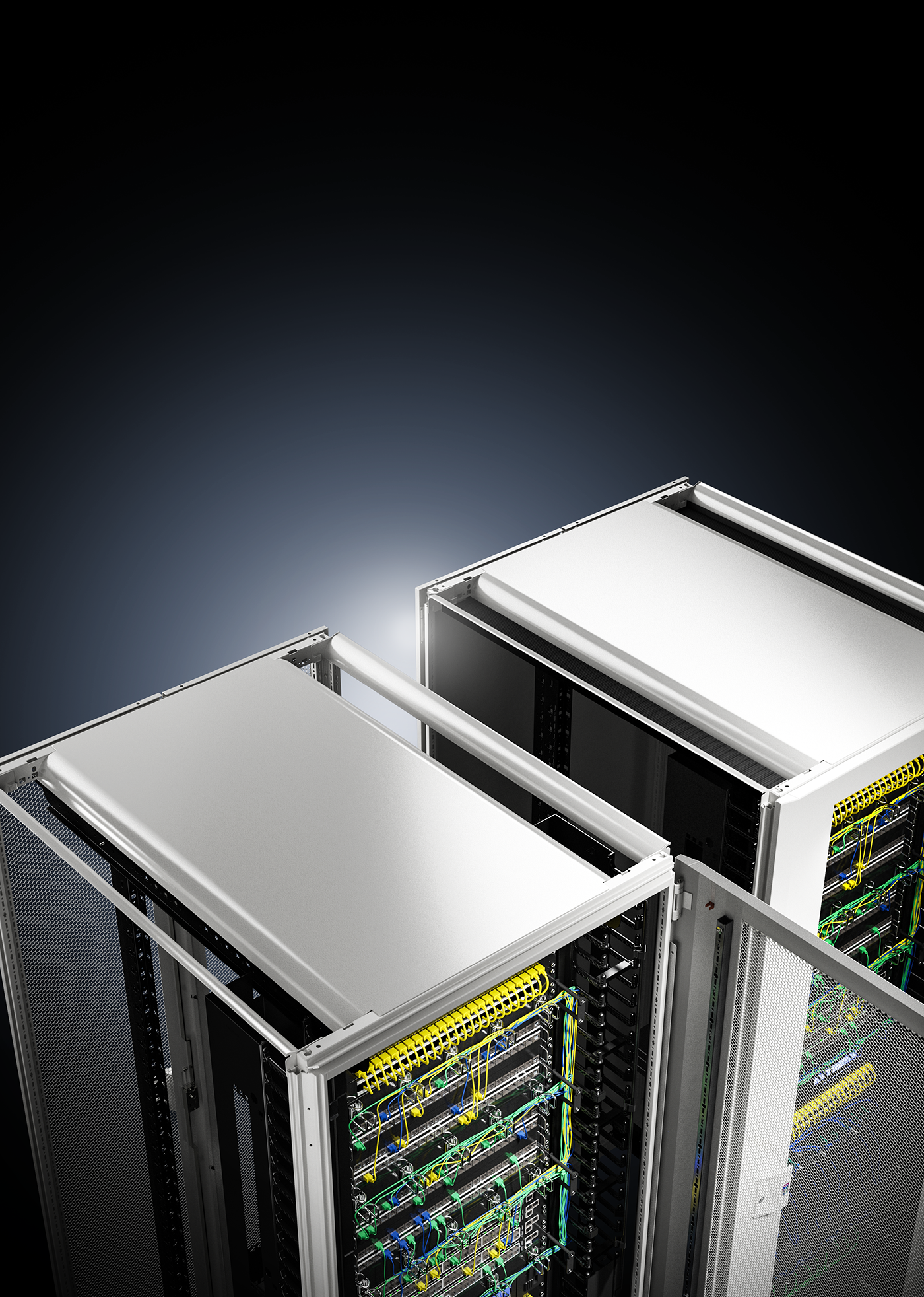 De voorgemonteerde, vrijstaande frameconstructie met een Rittal systeemraster en een gelast dak verhoogt de snelheid van zowel montage als demontage, en zorgt voor stabiliteit. De systeemcomponenten worden snel geplaatst en bevestigd dankzij het profiel met een doorlopend 25 mm steekpatroon en een genummerd gatenpatroon. De zijpanelen kunnen in een mum van tijd gemonteerd en weer verwijderd worden voor eenvoudig onderhoud.