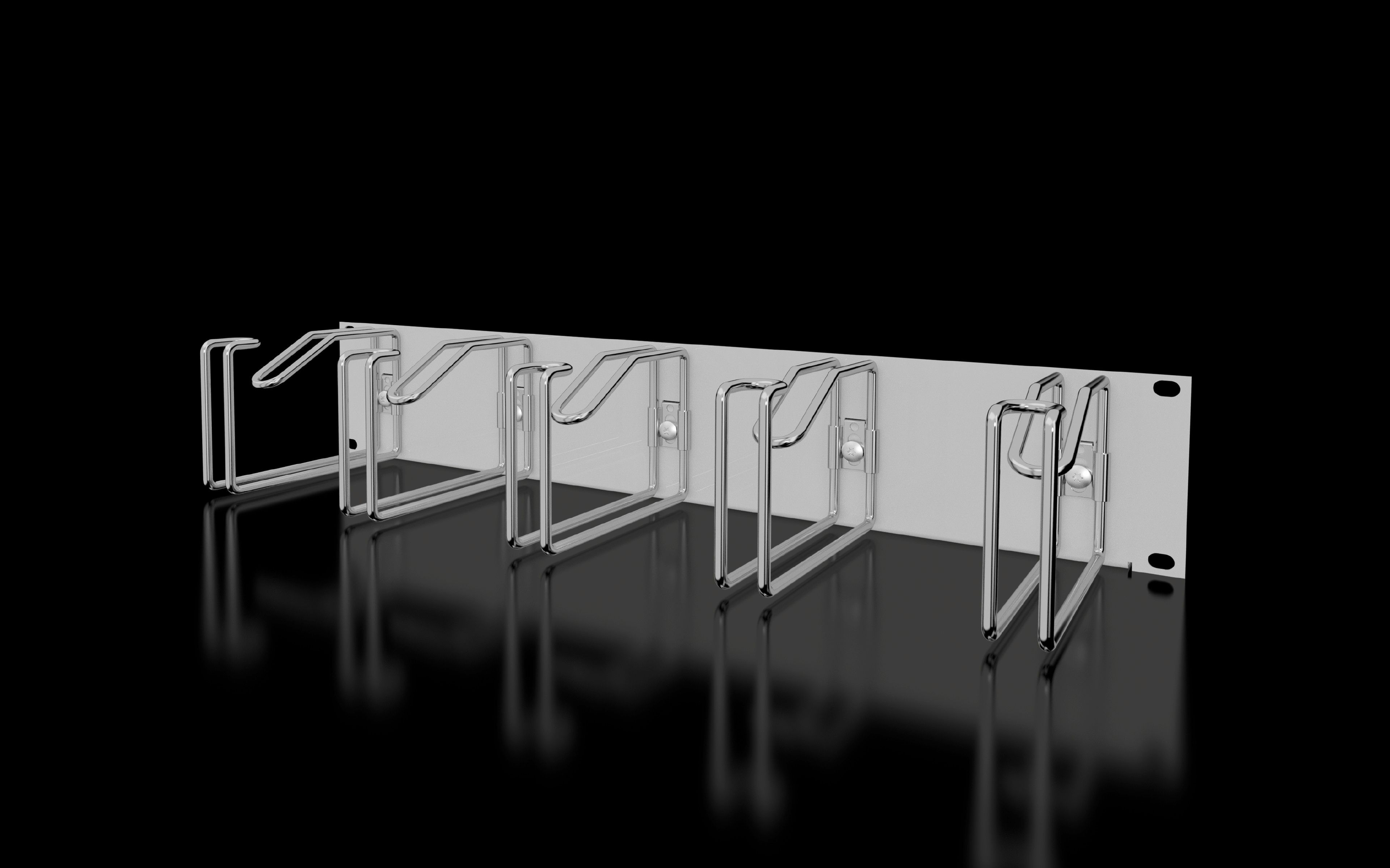 Rangeerpaneel met stalen beugels Voor het horizontaal rangeren van de patchkabels met 5 gemonteerde kabelgeleidingsbeugels.