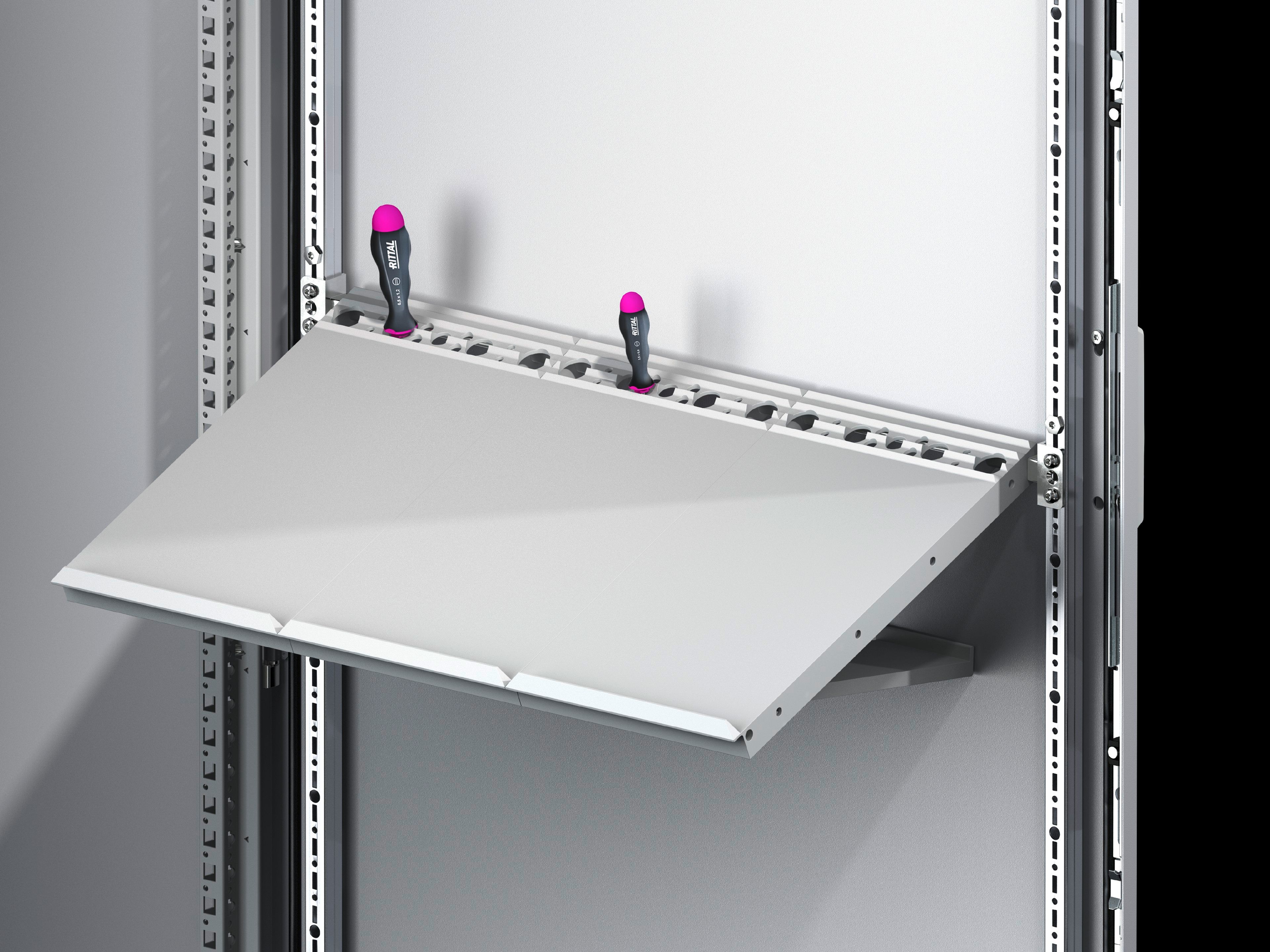 Pour déposer les plans de raccordement lors de la recherche des défauts et des travaux de maintenance. Les tablettes à plans peuvent être juxtaposées en fonction de la largeur de la porte. Le montage est réalisé sur le cadre tubulaire de porte ou sur le bandeau perforé de porte.