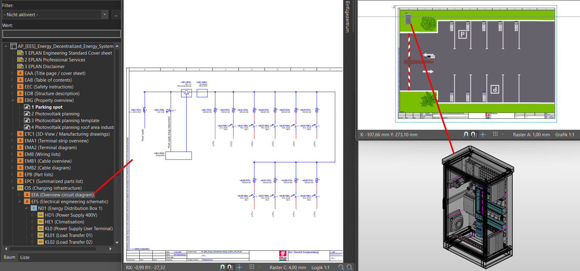 A compact transformer station with pre-planned project documentation being displayed in Essen makes it clear how implementation can be achieved with Eplan. The planning and designing of the transformer station with a medium and low-voltage system is presented; this is available in the Eplan Cloud as a standard industrial project. In practice, it can be used to plan grid stations or develop complete decentralised energy systems in a more standardised manner. A special equipment and parts list, considered necessary in the energy sector, is also supplied as default.
