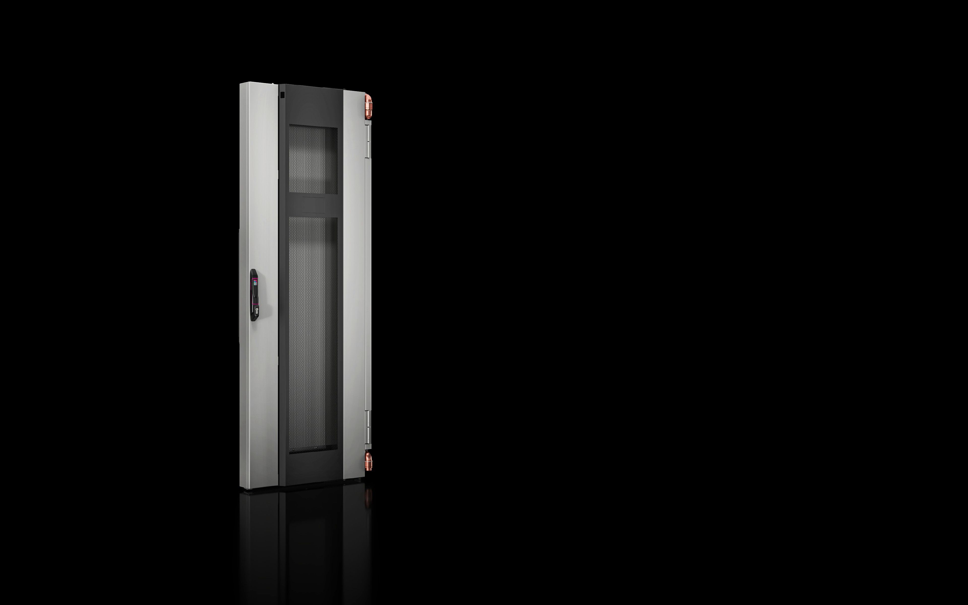 The passive module is an air/water heat exchanger in an enclosure for direct mounting on VX IT or TS IT racks in place of the rear door. The slimline design and a door opening angle of 180° allows rear access to the server enclosure and makes assembly and configuration inside the rack easier. The hot air expelled by devices in the server rack passes through the heat exchanger module and its thermal energy is emitted to a cold water system. There, the air is cooled and emitted into the room at the rear. Optimum energy efficiency with zero electrical power consumption.