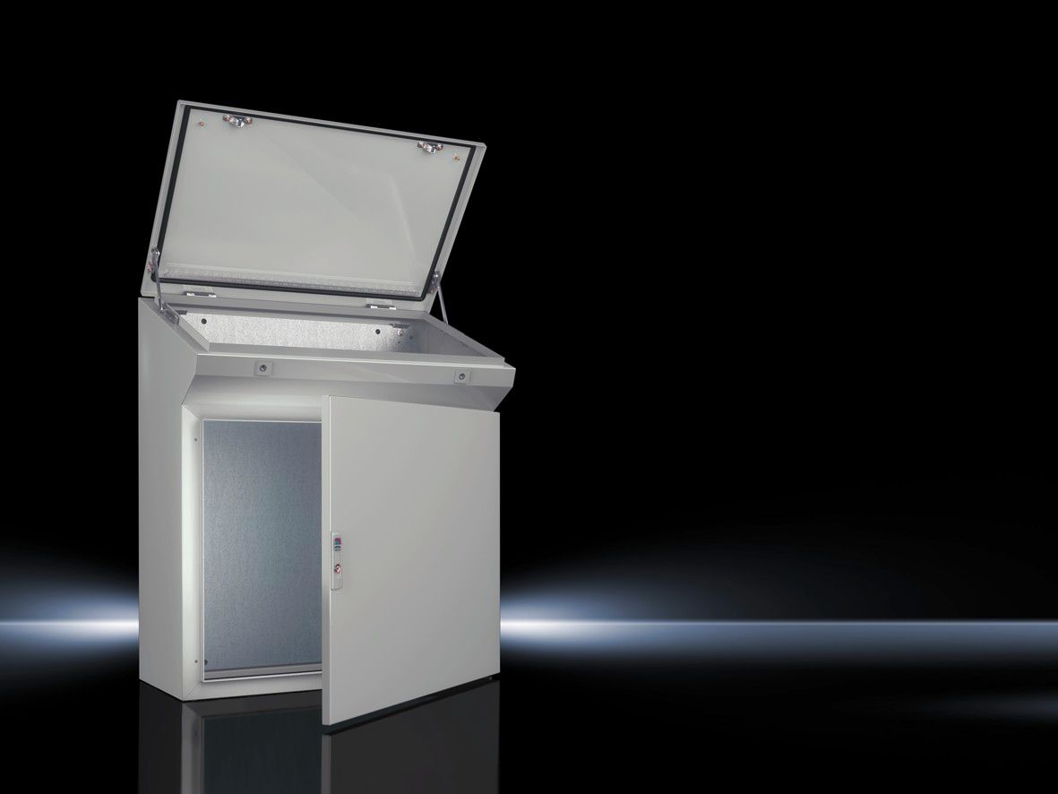 One-piece console for operating and monitoring, with large mounting plate and a high protection category of IP 55, available in four different widths. The AX lock plate ensures a uniform appearance, and two-part gland plates are included with the supply for simple cable routing.
