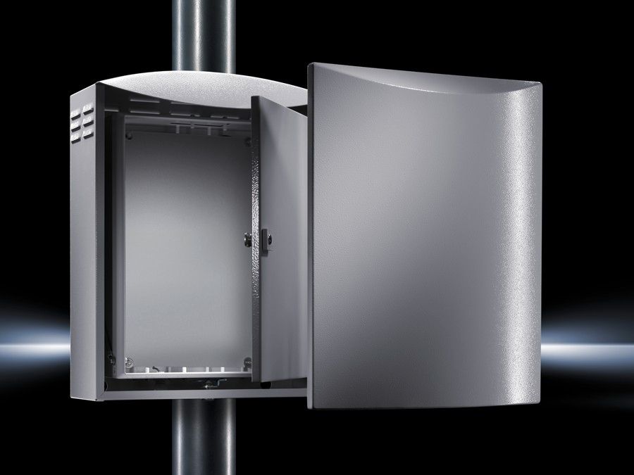Outdoor wall-mounted enclosures Outdoor enclosures for wall or pole mounting. Enclosure-within-an-enclosure concept, outer enclosure with cut-out at the bottom and integrated louvres on the rear panel and side panels for ventilation.