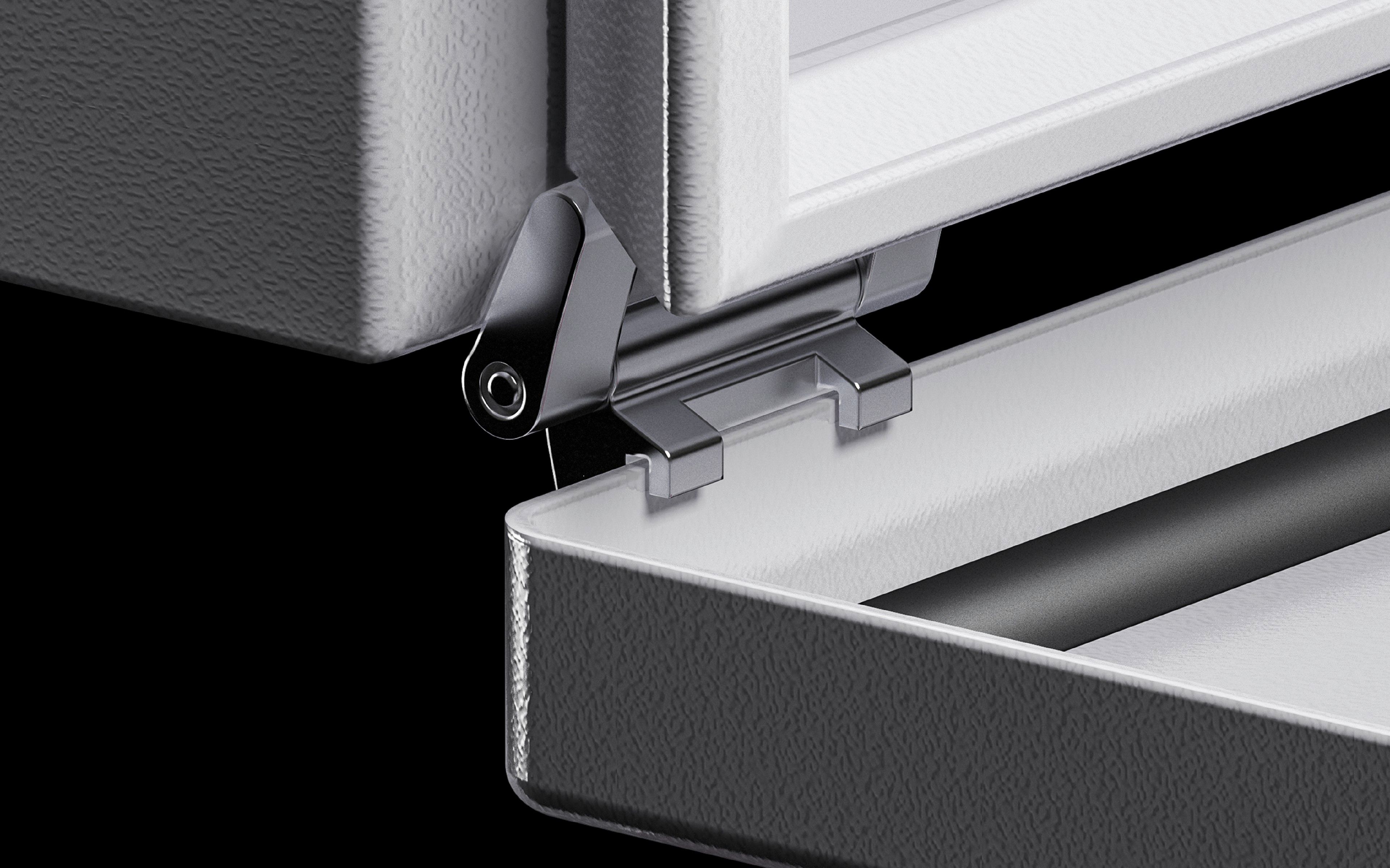 Cover hinge for terminal box KX The cover hinge may be screw-fastened all the way round the enclosure protection channel and to the edge fold. The position of the installation holes is prepunched, so no need to measure and mark out. To extend the door opening angle to 180°.