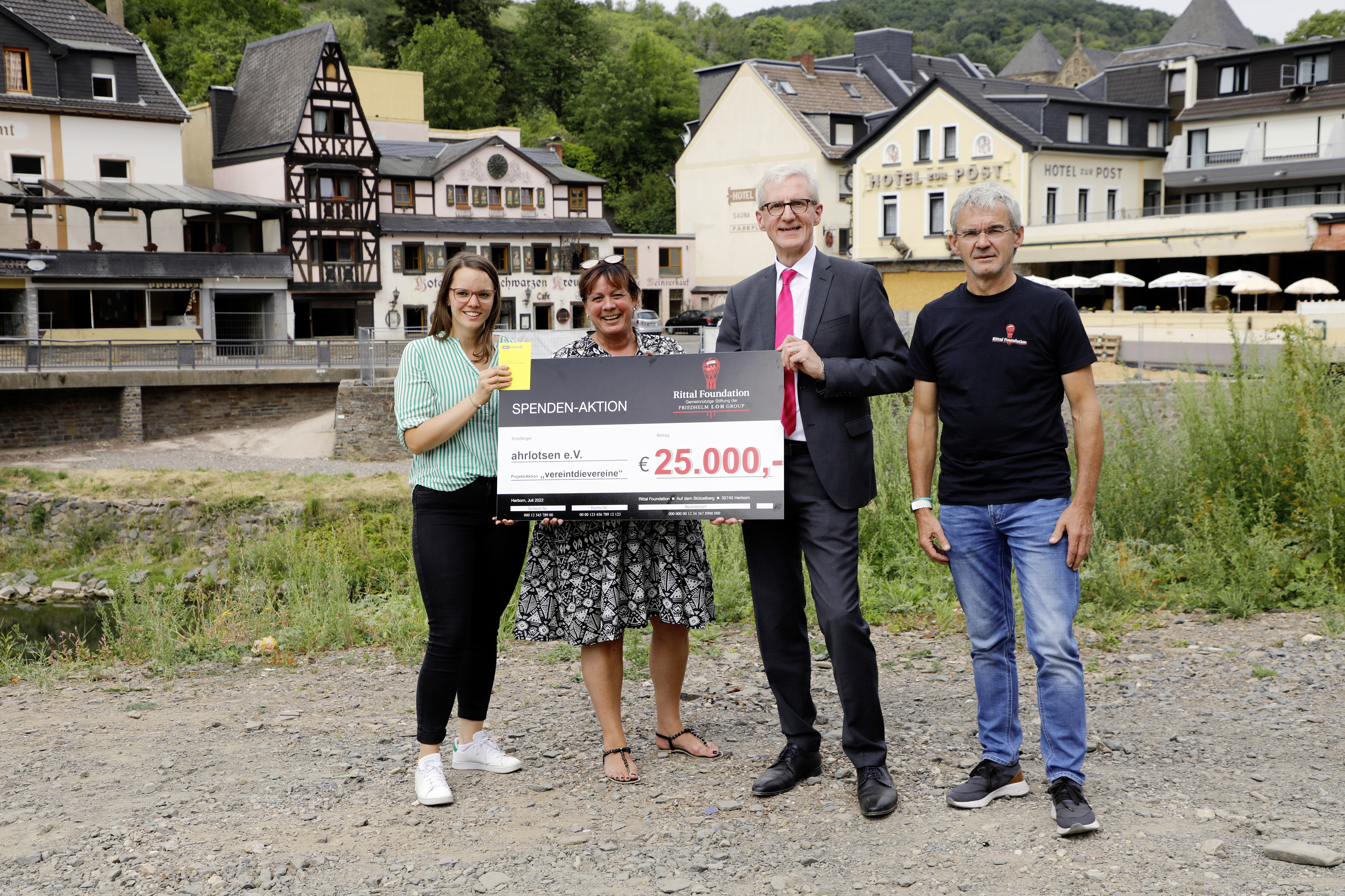 Mit der Rekordsumme von 930.000 Euro helfen die Mitarbeitenden der Friedhelm Loh Group und die Rittal Foundation den Betroffenen der Flutkatastrophe seit Sommer 2021 in der größten Not. Jetzt hat die gemeinnützige Stiftung der Unternehmensgruppe weitere 50.000 Euro an zwei Initiativen übergeben: Die Vereine „ahrlotsen e.V.“ und „Spenden-Shuttle“, die betroffenen Menschen im Ahrtal eine starke Stütze im Alltag sind.
