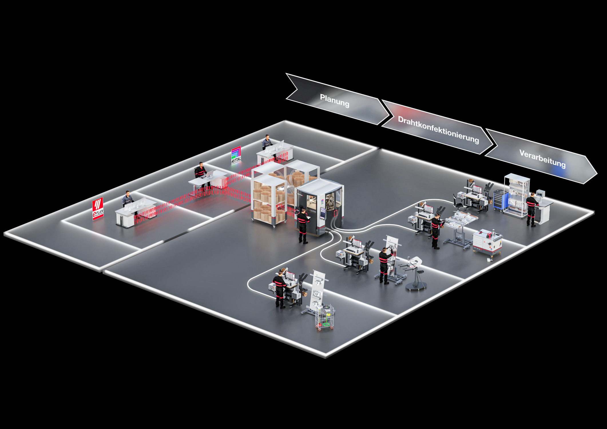 Dass die Drähte dabei immer zum richtigen Zeitpunkt und in der richtigen Reihenfolge an die Arbeitsplätze gelangen, wird durch die Einbettung des „Wire Handling Systems“ in die Softwarelösung „Eplan Smart Production“ sichergestellt. Basierend auf den im Engineering erstellten Daten eines Digitalen Zwillings führt „Eplan Smart Production“ als digitales Assistenzsystem mit „Eplan Smart Wiring“ Schritt für Schritt durch die Verdrahtung und fordert über den Wire Terminal und das Ausgabesystem die jeweils benötigten Drähte bedarfsgerecht an. Das macht es möglich, dass selbst weniger erfahrene oder angelernte Personen eine fehlerfreie und deutlich beschleunigte Verdrahtung durchführen können. So sind bei der Drahtkonfektionierung zum Beispiel Zeiteinsparungen von bis zu 90 Prozent möglich.