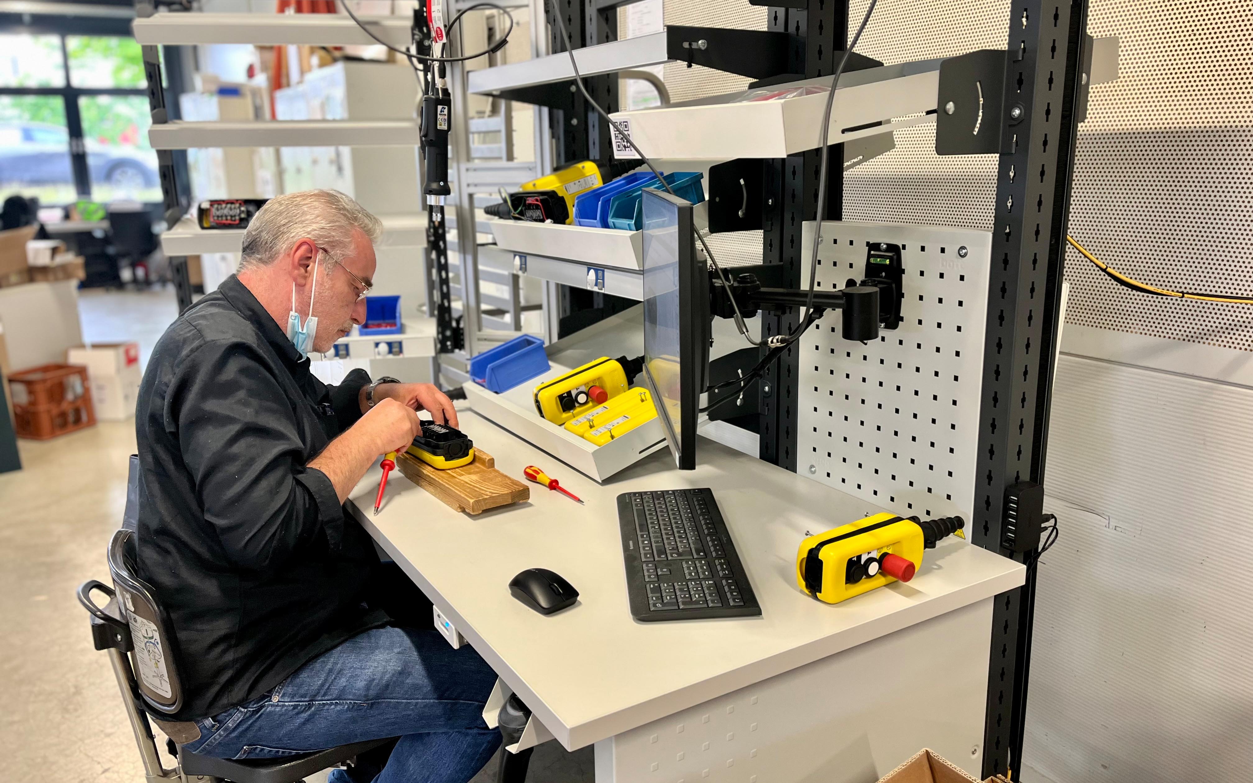 In der AWO Werkstatt am Siegener Garnisonsring ist durch Hilfe der Rittal Foundation ein sogenannter digitaler Pick-by-Light-Arbeitsplatz entstanden. Über Lichtsignale zeigt dieser Dirk Röcher an, welches Bauteil er aus den Fächern nehmen muss, um es dann zum Endprodukt, einer Kransteuerung, zusammensetzen zu können. Schrauben hierhin, Drähte dorthin. Missverständnisse ausgeschlossen. Denn der smarte Arbeitsplatz versteht viel von Fehlerkultur. „Schritt für Schritt“, erklärt Betriebsleiter Axel Wagenknecht, „führt das System von Beginn an durch den Produktionsprozess und dokumentiert dazu die Fertigungsschritte.“ Rüstzeug für eine Arbeitswelt, die nicht nur immer digitaler, sondern auch immer komplexer wird.