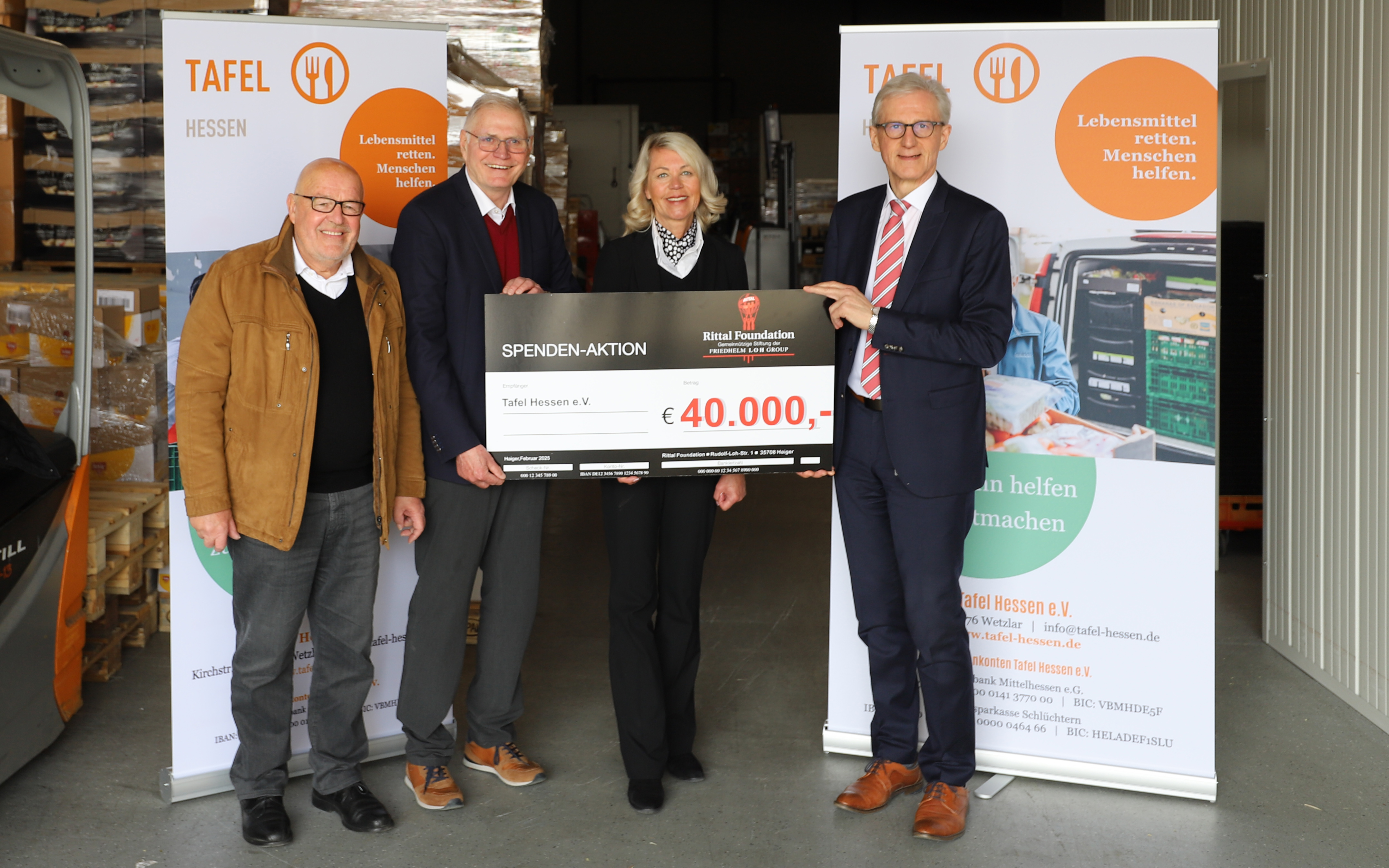Mit insgesamt 40.000 Euro unterstützen die Rittal Foundation sowie die Mitarbeiterinnen und Mitarbeiter der Friedhelm Loh Group in diesem Jahr die Arbeit der Tafel Hessen. Für die vielen Ehrenamtlichen vor Ort – vor allem aber für rund 110.000 Menschen in Hessen, die auf das Angebot der Tafeln angewiesen sind – ist diese Hilfe von enormer Bedeutung. Entsprechend groß fiel auch der Dank der Verantwortlichen bei der offiziellen Scheckübergabe am 11. März im Zentrallager der Tafel Hessen in Wetzlar aus.