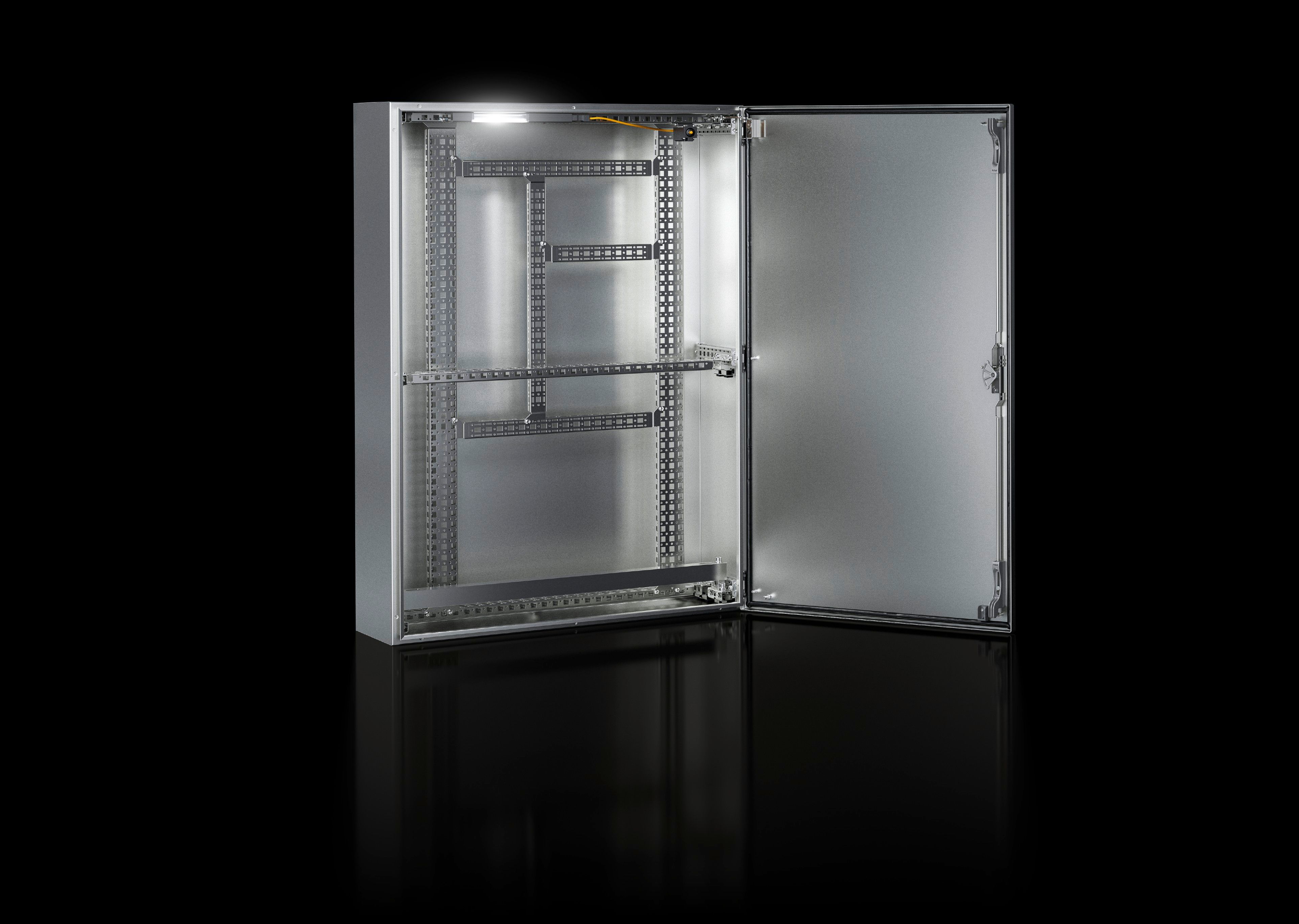 - AX Kompakt-Schaltschrank, BHT: 600x600x210 mm, Edelstahl 1.4301, mit Montageplatte, eintürig, zwei Vorreiberverschlüsse