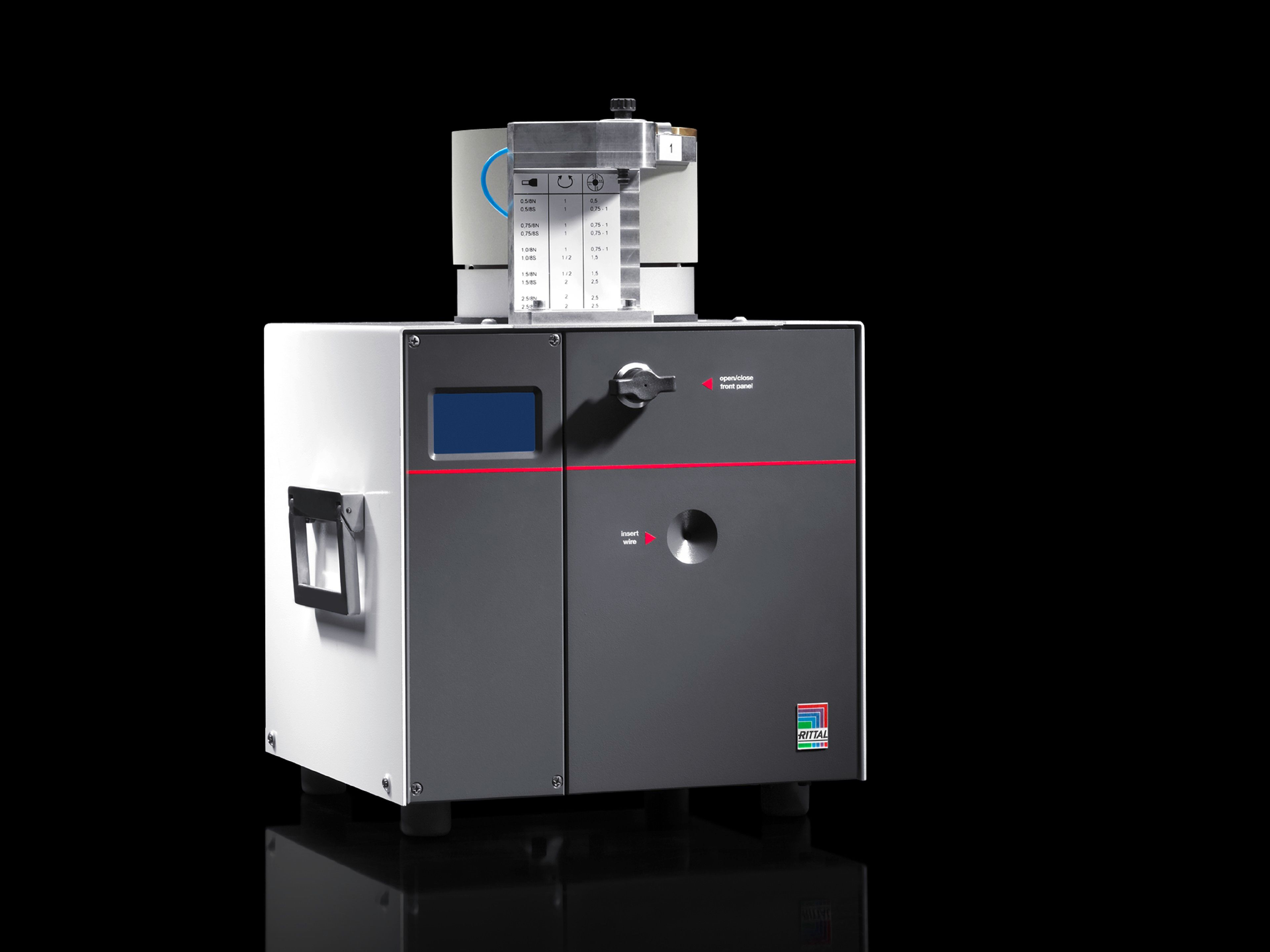 - Elektropneumatisch angetriebener Abisolier- und Crimpautomat für lose isolierte Aderendhülsen.