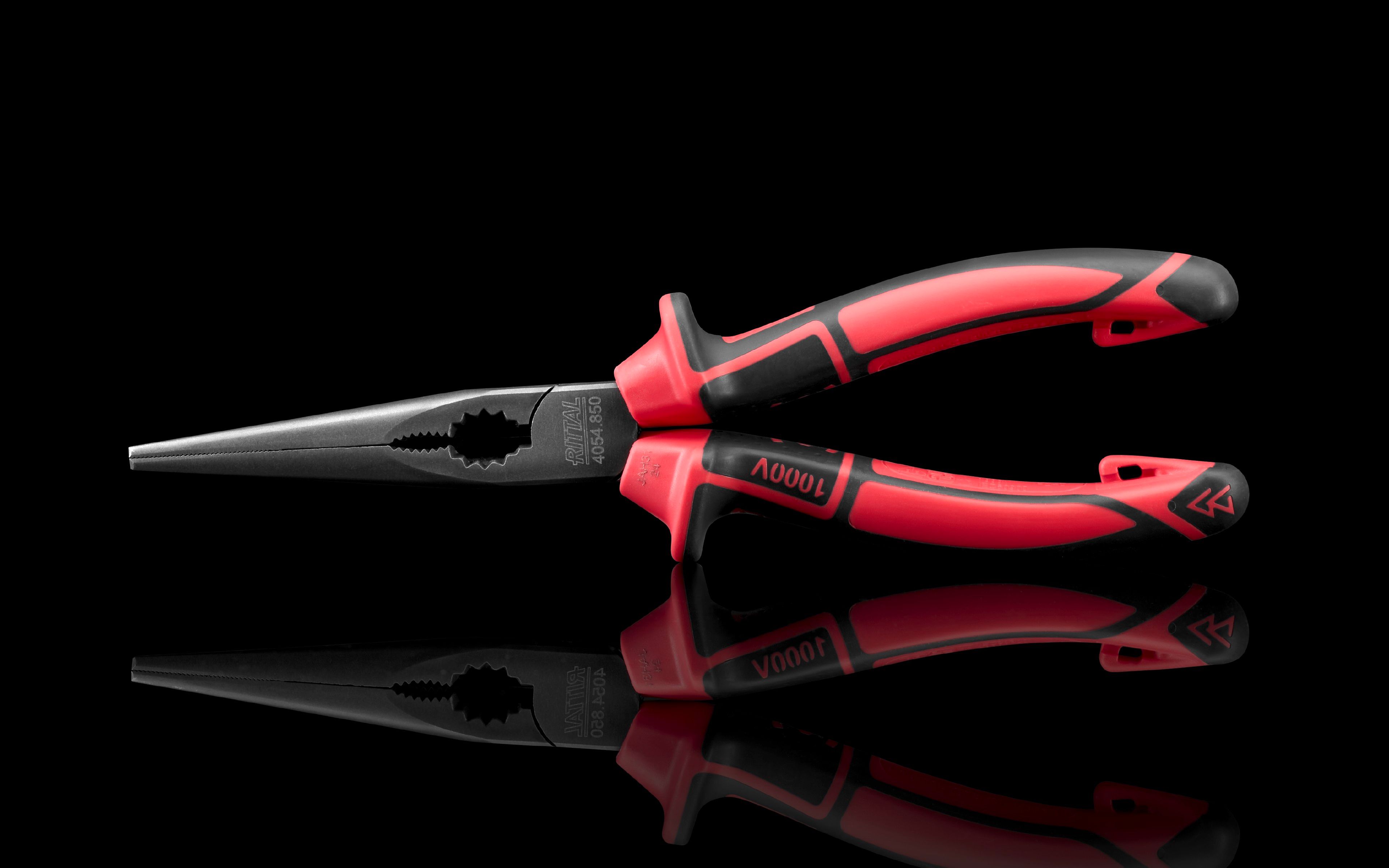 Spitzzange mit isoliertem Griff, Greiffläche gezahnt, mit Schneide