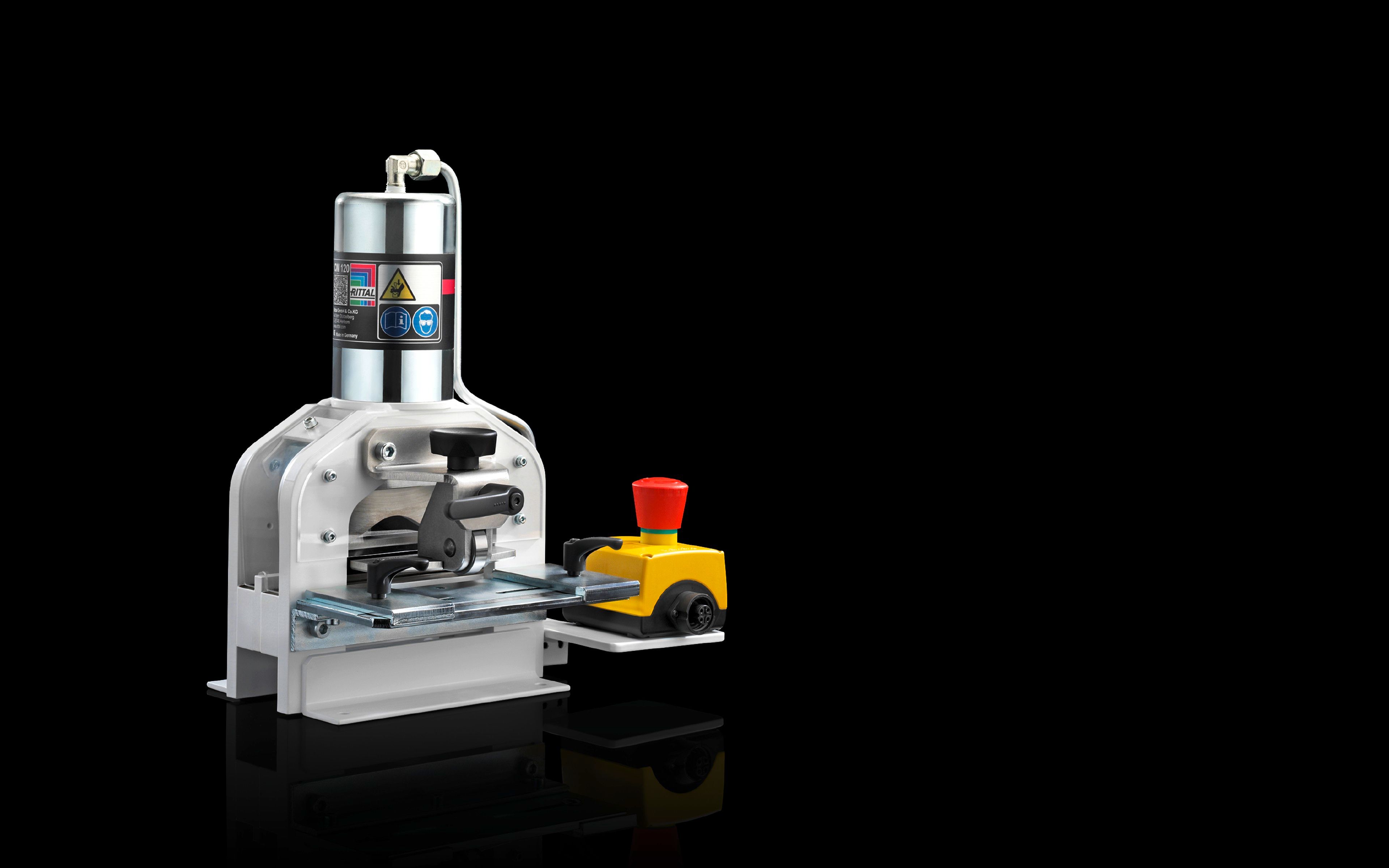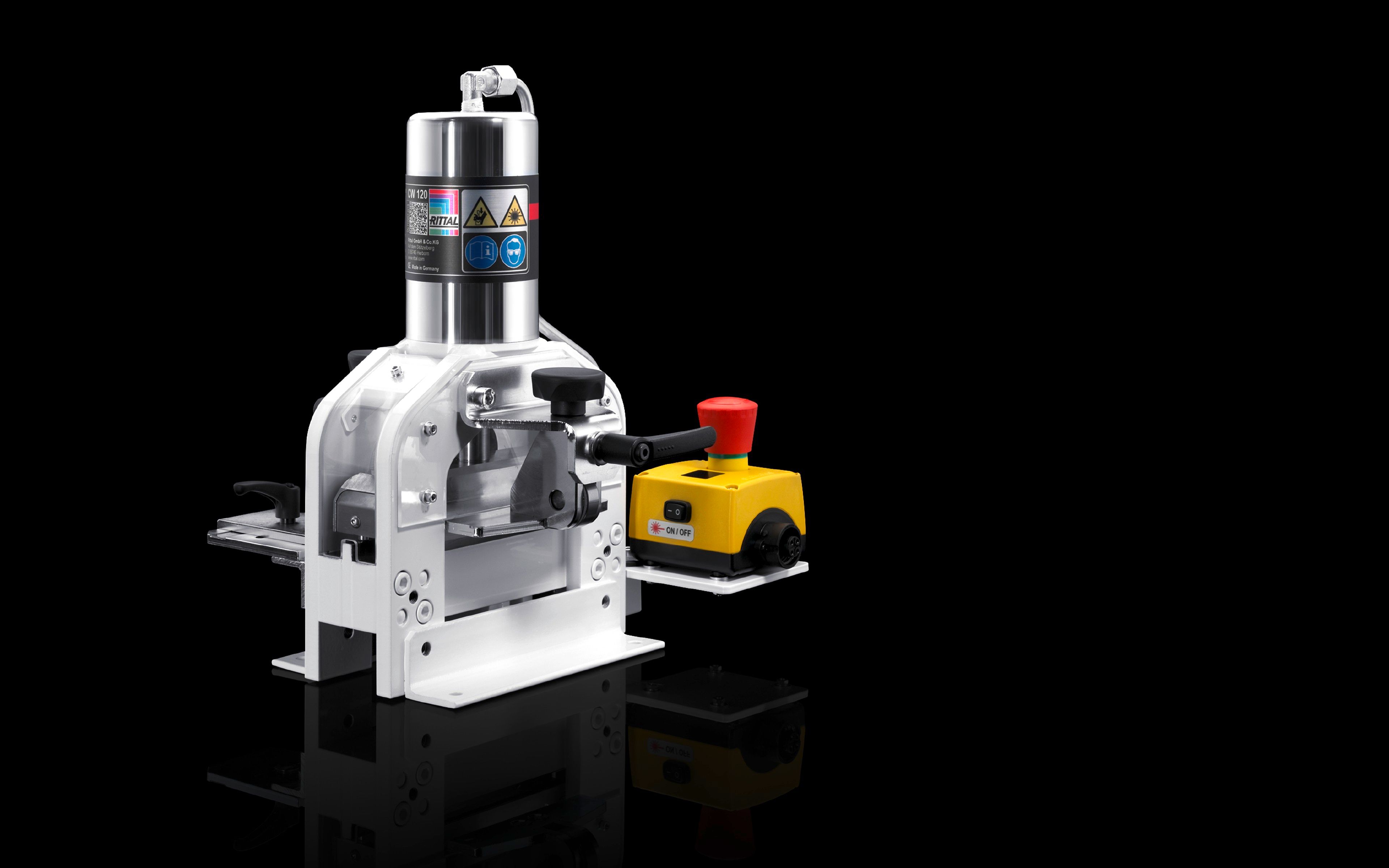 Stromschienenzuschnitteinheit CW 120-S. Das Zuschnittgerät der Produktreihe CW 120-S eignet sich zum Ablängen von Stromschienen. Das Gerät kann einfach auf einer Werkbank montiert werden.