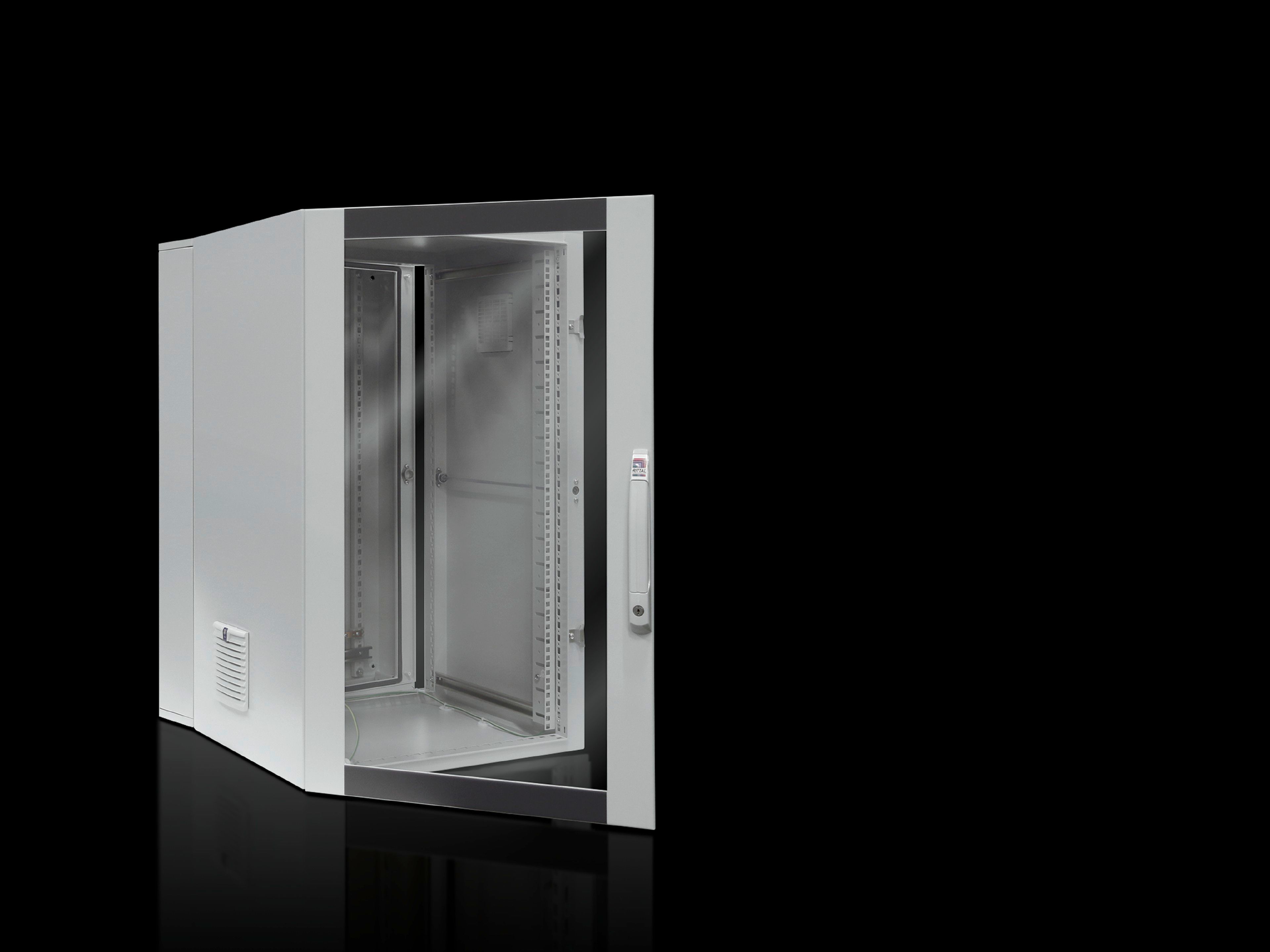 Schwenkteil mit 25 mm-Lochraster im Front- und Rückrahmen, zwei 19"-Profilschienen, vorne, stufenlos tiefenvariabel und seitlichen Austrittsfiltern links und rechts