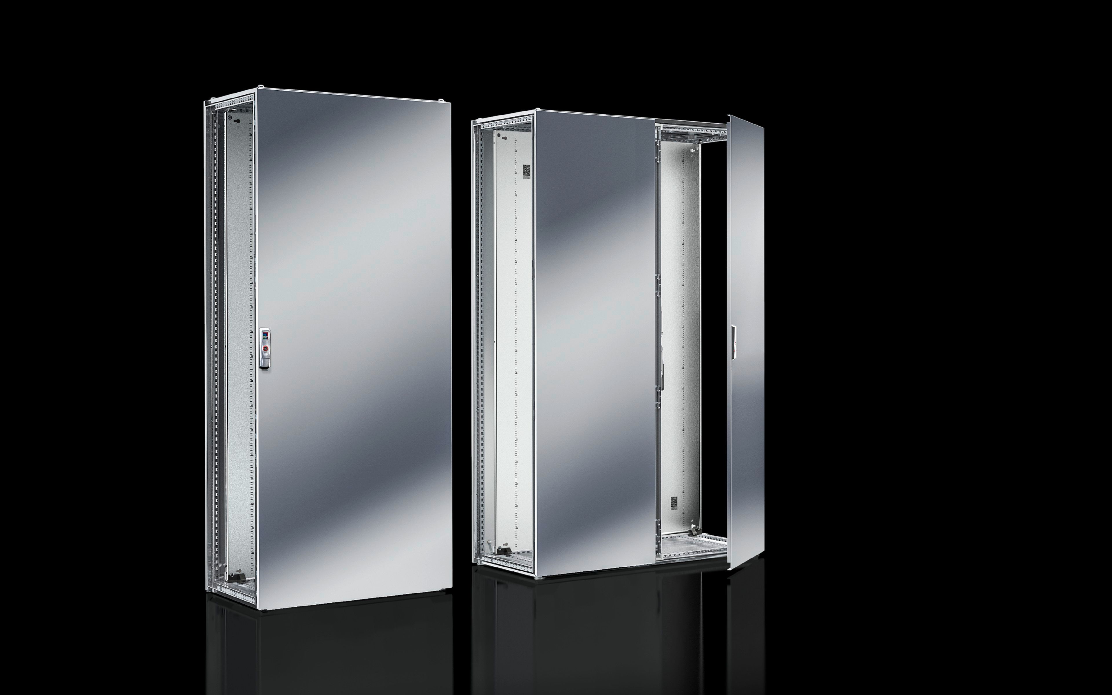 Rækkemonteret gulvskab VX25, rustfrit stål Gulvskab Standard inden for elskabskonstruktion i rustfrit stål af høj kvalitet 1.4301 (AISI 304): Skabsramme med en eller to frontlåger, bagplade, montageplade, topplade, delte bundplader. Velegnet til effektiv skabsudbygning. Få mere at vide