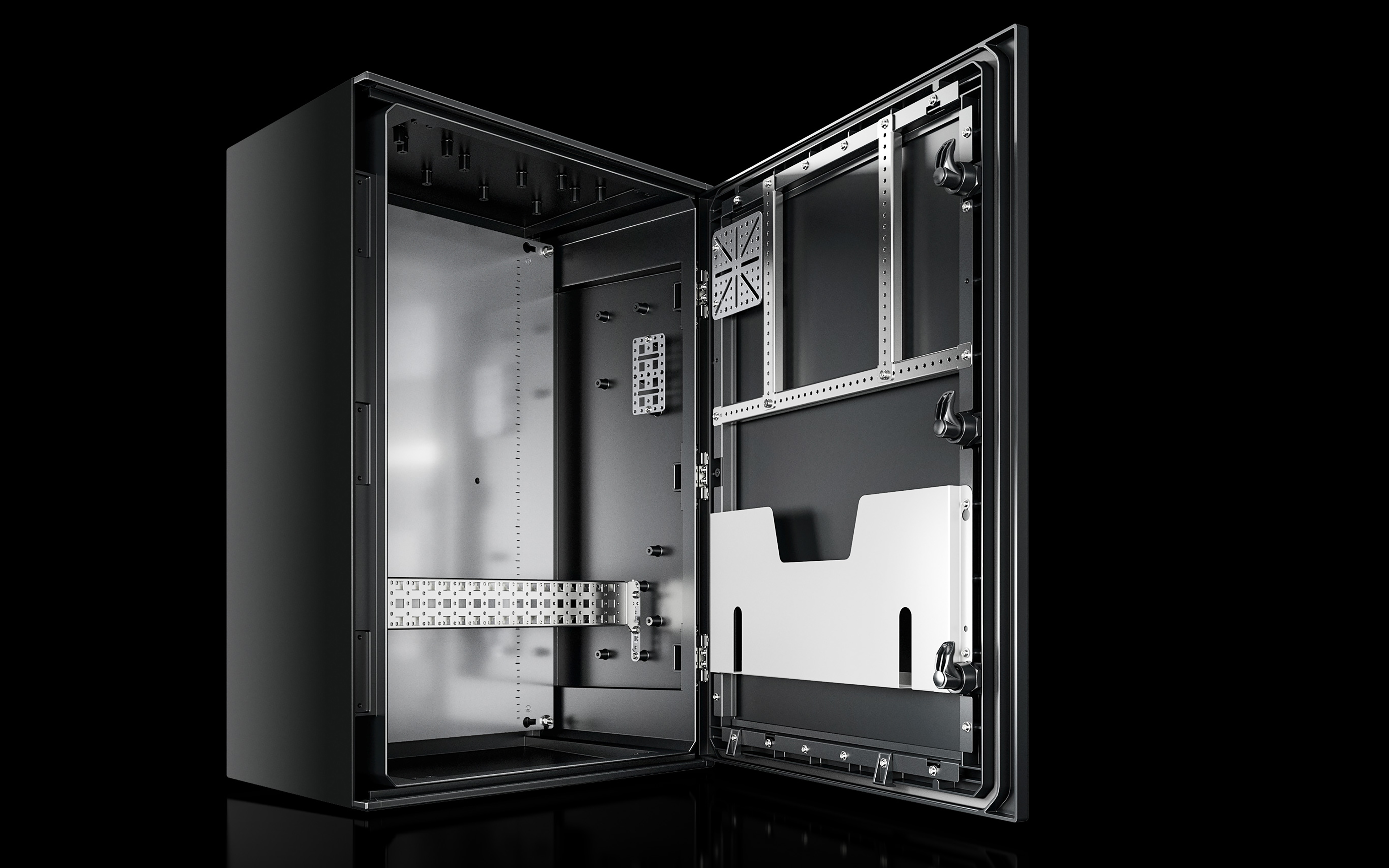 Al mismo tiempo, las nuevas cajas Ex simplifican el equipamiento interior y ofrecen muchas más opciones de montaje. Los numerosos orificios de fijación de la caja ofrecen un equipamiento interior más sencillo, ya que permiten atornillar de forma rápida y directa los accesorios del sistema, como el chasis y los carriles, en el interior de cada caja. Los interruptores de posición de la puerta y las cerraduras de la puerta también se pueden montar directamente en los orificios de fijación. Además, los carriles DIN se pueden atornillar directamente en los orificios de fijación existentes en la caja. La placa de montaje puede simplemente atornillarse en los pernos premontados desde la parte delantera e incluso conectarse a tierra posteriormente mediante el ojo de la cerradura existente. Asimismo, el montaje en la pared se puede realizar fácilmente utilizando las tuercas a presión externas sin perder la homologación UL ni la clase de protección.