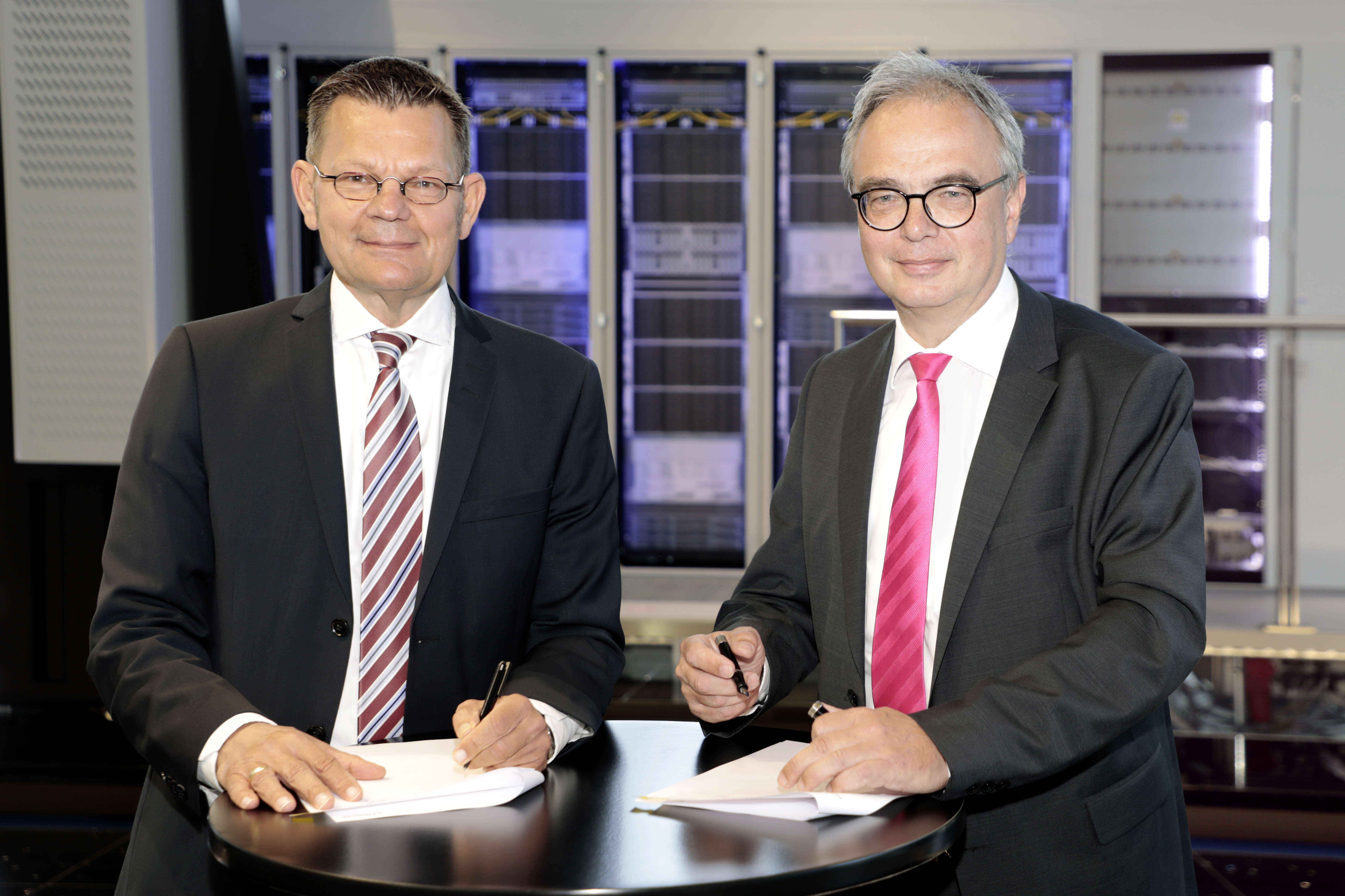 Helmut Binder, CEO Paessler (left), and Uwe Scharf, Rittal’s Managing Director BUs and Marketing, seal the cooperation for the monitoring solutions.