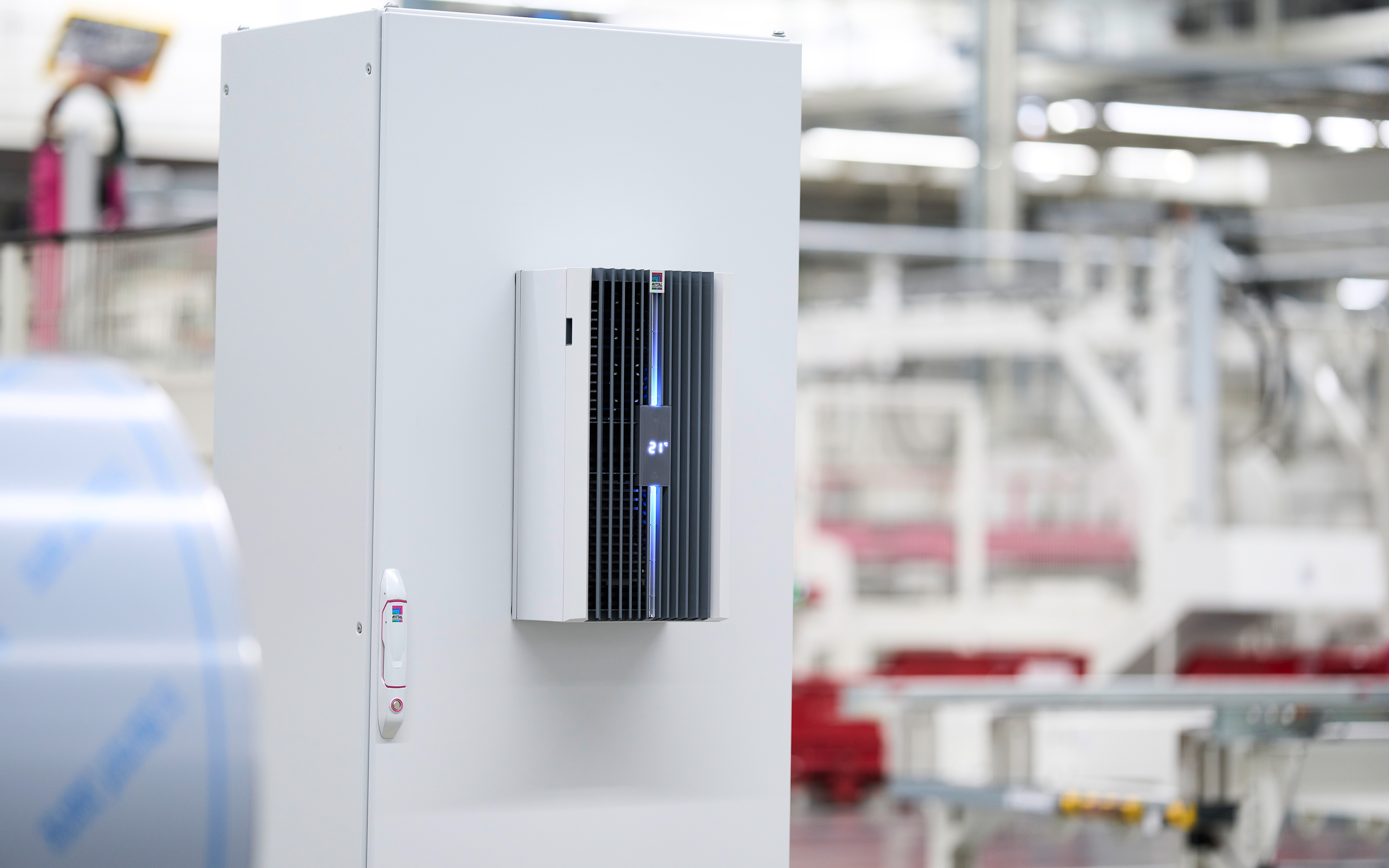 O que está por trás dessa economia de energia e, redução de custos, é a tecnologia usada, combinando um tubo de calor com componentes controlados por inversor. O tubo de calor funciona sem compressor, válvula de expansão ou outros elementos reguladores e, assim, não precisa de energia elétrica, exceto para operar o ventilador. Dependendo da energia térmica gerada no armário e da temperatura ambiente atual, a refrigeração pode ser realizada apenas com o tubo de calor. A refrigeração adicional do compressor só funciona se uma grande quantidade de calor tiver que ser dissipada do armário ou se a temperatura ambiente for muito alta. E mais, quando funciona, é muito mais eficiente em termos energéticos do que as unidades convencionais. Isto acontece porque o compressor e os ventiladores possuem um acionamento controlado por inversor, que ajusta automaticamente as suas velocidades de acordo com as necessidades. Como resultado, a temperatura dentro do armário permanece constante e a eficiência energética é significativamente maior do que com outras unidades de climatização convencionais.